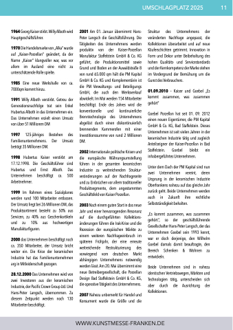 2001 Am 01. Januar übernimmt Hans- Peter Langsch die Geschäftsführung. Die Tätigkeiten des Unternehmens werden produktiv von der Kaiser-Porzellan Manufaktur Staffelstein GmbH & Co. KG geführt, die Produktionsmittel sowie Grund und Boden an der Auwaldstraße 8 von rund 65.000 qm hält die PM Kapital GmbH & Co. KG und Komplementärin ist die PM Verwaltungs- und Beteiligungs GmbH, die auch den Werksverkauf abwickelt. Im Mai werden 154 Mitarbeiter beschäftigt. Ende des Jahres wird die konventionelle und kontinuierliche Brenntechnologie des Unternehmens abgelöst durch einen diskontinuierlich brennenden Kammerofen mit einer Investitionssumme von rund 2 Millionen DM.