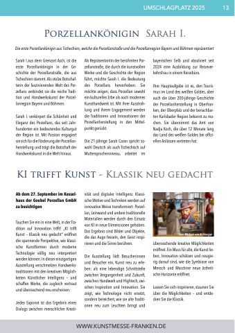 Als Repräsentantin der berühmten Por- zellanstraße, die durch die kunstvollen Werke und die Geschichte der Region führt, möchte Sarah I. die Bedeutung des Porzellans hervorheben. Sie möchte zeigen, dass Porzellan sowohl ein kulturelles Erbe als auch modernes Kunsthandwerk ist. Mit ihrer Ausstrah- lung und ihrem Engagement werden die Traditionen und Innovationen der Porzellanherstellung in den Mittel- punkt gerückt.
