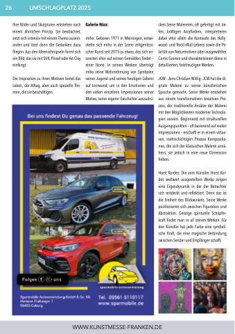 Horst Kordes: Die vom Künstler Horst Kor- des weltweit ausgestellten Werke zeigen eine Eigendynamik in der der Betrachter sich entdeckt und reflektiert. Denn das ist die Freiheit des Blickwinkels. Seine Werke positionieren sich zwischen Figuration und Abstraktion. Geistige spirituelle Schöpfer- kraft findet man in all seinen Werken. Für den Künstler hat jede Farbe eine symboli- sche Kraft, die eine magische Verbindung zwischen Sender und Empfänger schafft.