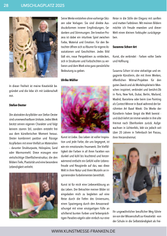 Susanna Schorr ist eine vielseitige und en- gagierte Künstlerin, die mit ihren Werken, öffentlichen Mitmal-Projekten für den guten Zweck und als Workshopleiterin Men- schen inspiriert, verbindet und berührt.Ob in Paris, New York, Dubai, Berlin, Mailand, Madrid, Barcelona oder beim Live Painting als Contest Winner in Basel während der be- rühmten Art Basel Week: Die Werke der Künstlerin haben längst die Welt bereist - und doch kehrt sie immer wieder in ihre alte Heimat nach Oberfranken zurück. Aufge- wachsen in Lichtenfels, lebt sie jedoch seit über 20 Jahren in Tiefenbach bei Passau, ihrer Herzensheimat.