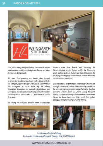 "Die „Horst Ludwig Weingarth Stiftung“ widmet sich - neben vielen weiteren sozialen und ökologischen Themen - vor allem dem Bereich der Kunstwelt.